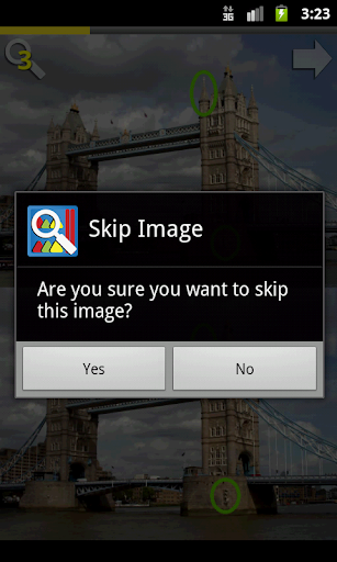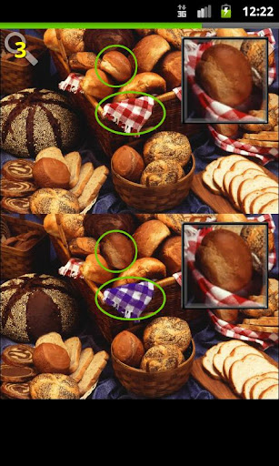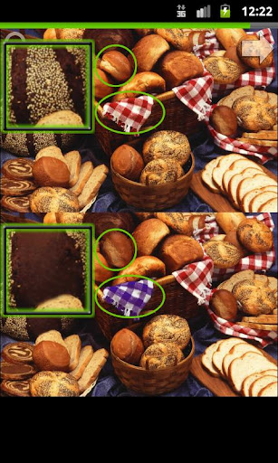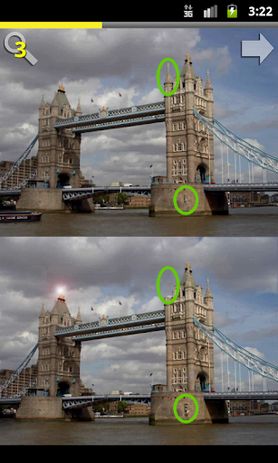 Touch and hold or drag on the lower image to use the magnifying glass. The magnifying glass will glow when a difference is discovered. Once the difference is found, tap that spot. Size, zoom and glow are adjustable in the menu.