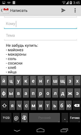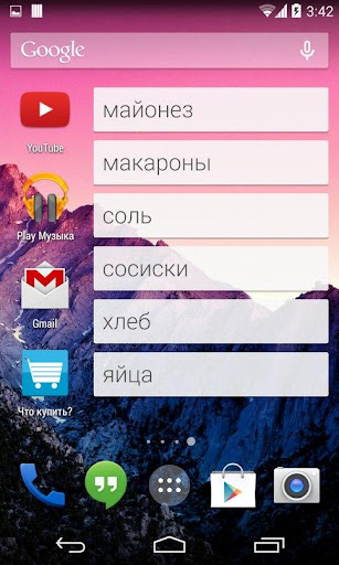 What to buy? - it's a smart shopping list that can be used on the lock screen . Tired of having to remember a long time , what do you miss? Intelligent ranking system will choose the products that you commonly buy and offer to add them first in compiling the list. And if you want to add something new - just start writing it and the program will find the right product in the ever-expanding database. Also, due to the widget that can be placed on the desktop or ( on android version 4.2 and above) on the lock screen , you can use our list of " What to buy ? " even without removing the phone from the lock , simply including the screen. A function for sending allow to share your list with anyone in a couple of clicks .