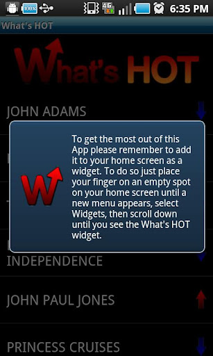 The What's HOT Widget is a simple app that helps keep you up to date on the latest trending topics. When you add this widget to your home screen you will see the top four Google search terms along with arrows that show if the topic is gaining or losing popularity. You can also select the MORE option to see the full list of the most popular Google search terms. Selecting a topic will send you to the Google News search results for that term so you can quickly find out why that topic is interesting.