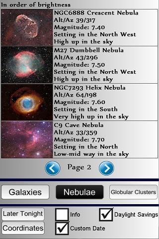 Browse through a list of hundreds of galaxies, nebulae and globular star clusters all currently in your sky!