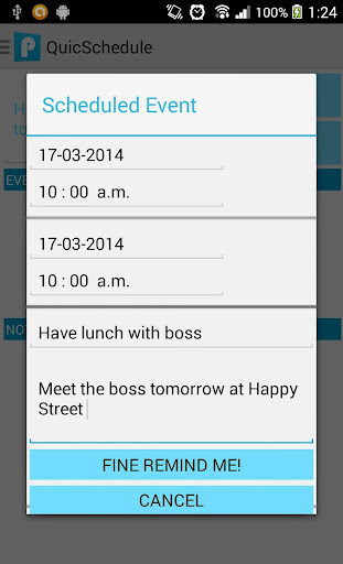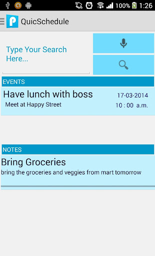 The application also allows voice commands, so you can just say "Meeting with boss at 6 p m tomorrow" and the application will understand it!