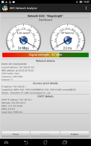 This is the ad free version of WiFi Network Analyzer application. (https://play.google.com/store/apps/details?id=com.pzolee.wifiinfo).