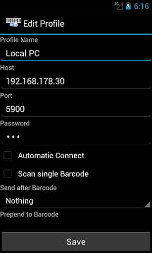 To add a profile from QR-Code scan "wifibarcodescanner://PASSWORD@HOST:PORT/PROFILENAME". Every part except host can be ommited (eg. wifibarcodescanner://192.168.0.10).