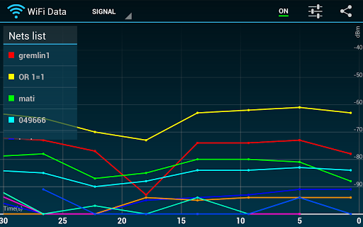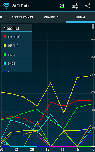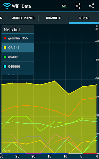 4) Signal tab – graph of time-dependent net signal strength. Small list showing every visible net. You can select most important network from list and watch how it's signal strength is changing in time.