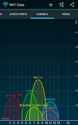 3) Channels tab – graph presentation of visible networks with parabola shape depending on signal strength and channel on which network is working.