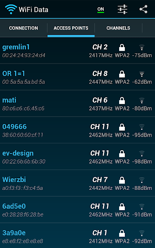 2) Acces points list tab – list of all visible network access points to your device. Every row describes one network with its name, channel, security and signal strength. You can sort this list by every attribute and discover networks around you!