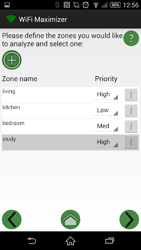 Press "Next" and the app will display a page where you can define the zones where you want to improve the wifi coverage (by example "study", living room", etc.). In the premium version you will also be able to define the priority of each zone, as "Low", "Medium" or "High". By example, the study might have the high priority, as it could be the place where you do your work, the living room might be medium priority and so on.