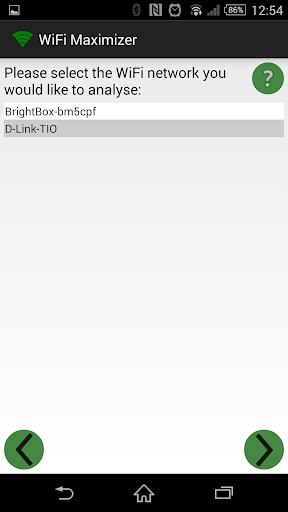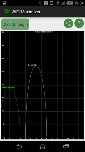 The app starts with a page displaying on a graph the wifi networks available. When you choose "Click to begin", a new page will appear, where you can select which wifi you want to improve.