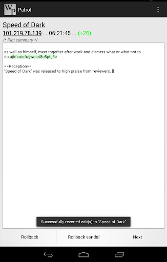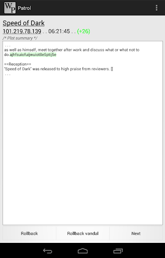 Fight Wikipedia vandals on the go! WikiPatroller allows you to revert vandalism to Wikipedia with the tap of a finger. Once logged in, WikiPatroller shows you a stream of recent changes, allowing you to identify and undo disruptive edits. Though designed for Wikipedia, it works with all wiki sites running MediaWiki software, including wikis in languages other than English. You can choose to see all edits, or only those made by anonymous IP users.