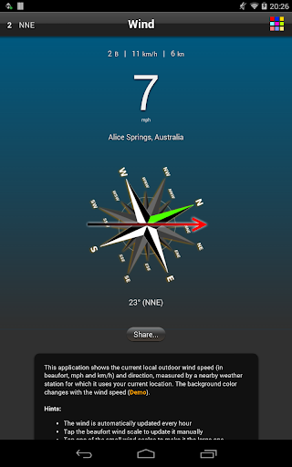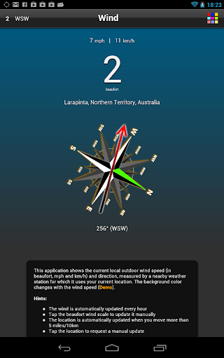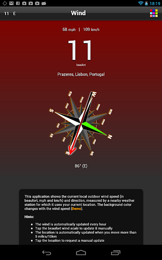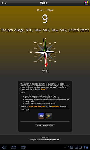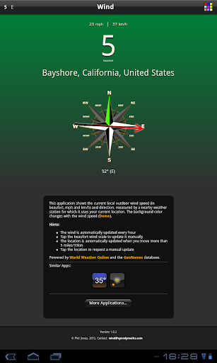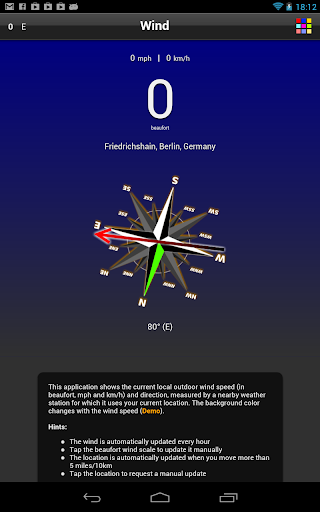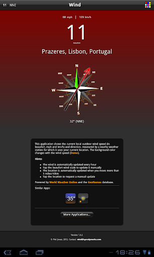 Do you want to go sailing, windsurfing, biking or just out of the door? This application shows the current local outdoor wind speed (in beaufort, mph, km/h and knots) and direction, measured by a nearby weather station for which it uses your current location.