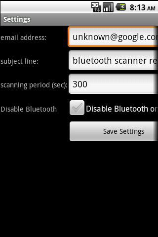 Wireless Monitor periodically scans for discoverable bluetooth devices and/or wifi visible networks and saves results in memory. The results later can be saved to a file or sent by email. There is an option in the settings that lets the service to disable bluetooth after each scan saving the battery. This option might not work on some devices. The service can be started/stoped from the menu. To run the scanning manually, enable bluetooth/wifi and press "Start discovery" button. Reports are available in the /sdcard/wireless-monitor-reports directory.