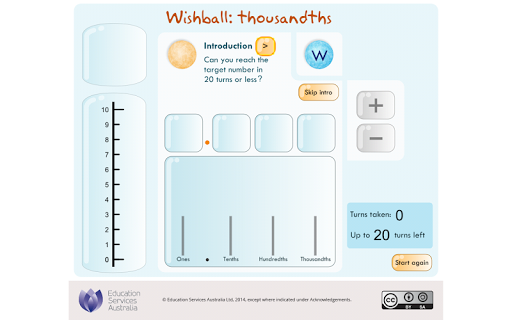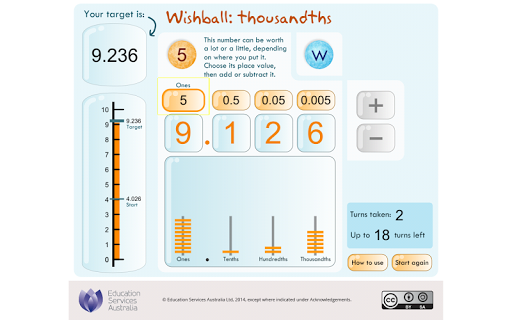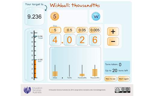 Test your understanding of decimal place value with numbers that include thousandths. Receive a starting number, such as 3.569, and work towards turning it into a target number, such as 7.832. Spin a random digit, choose its decimal place value and decide whether to add or subtract the random digit from your starting number. You can use a 'Wishball' to help you reach the target number. Try to achieve the target with as few additions or subtractions as possible. This learning object is one in a series of ten objects.