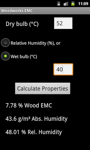 Determine the equilibrium moisture content of wood in a given climate by supplying the dry bulb and relative humidity. You can also use the wet bulb temperature instead of the relative humidity. The relative humidity and absolute humidity is also calculated.