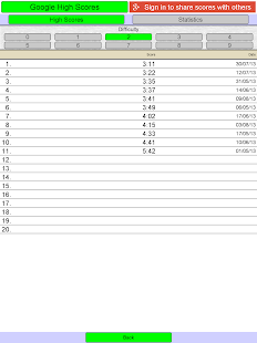 Each game is assigned a difficulty level from 0 (easy) to 9 (very hard). The difficulty level is determined by the settings. Each difficulty level maintains the high scores (measured by fastest time to complete the game). The game displays the best 20 scores for each difficulty level.