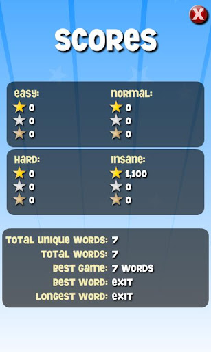 Stats will be saved during gameplay including: high scores, total words, best word, longest word, and more! You can also test your wordsmith abilities with the unique word count that keeps track of all unique words you have spelled throughout the game.