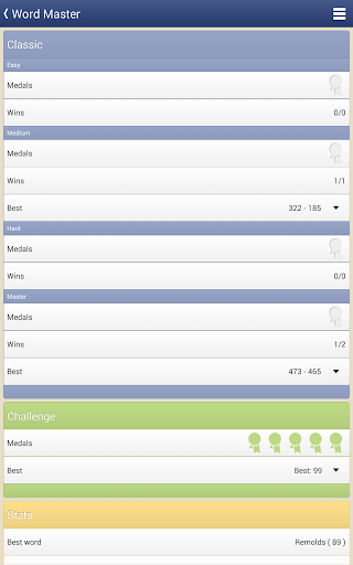 • Keep track of your records and stats (e.g. best final score, best word ever played and more).