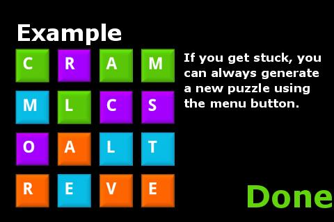 If you get stuck, you can generate a new puzzle using the menu, or ask for the answer.
