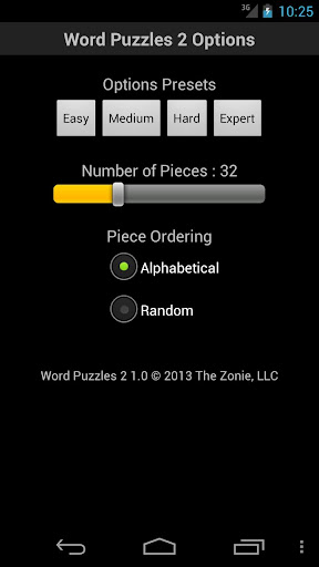 - Optionally choose from Easy, Medium, Hard, or Expert presets to quickly select between predefined Number of Pieces / Piece Ordering combinations.