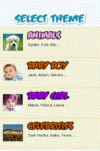 -Plenty Themes with interesting categories like Baby names, Celebrities, Cities, Food, Movies, Sports etc