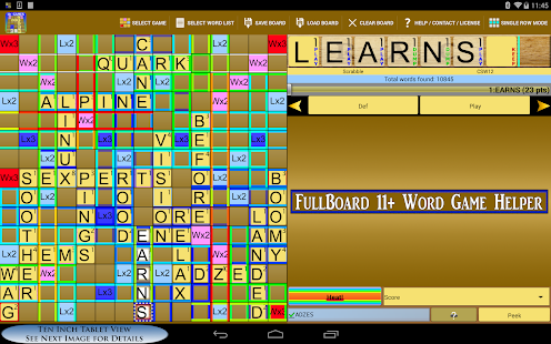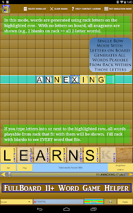 If you cheat, you won't learn, so play each turn on your own, then go to FullBoard, press the Peek button to see THROUGH the helper to your word game, release the button to see the helper again, and tap your game's latest words onto the helper's board and rack using any keyboard you like (soft, slide-out or EXTERNAL). Playable words appear and update on your full game board as you type - "you don't even have to ask!"℠ The highest-rated word appears first, and you can view additional words without ever leaving the screen where you entered your letters. It's like having a spreadsheet for words!