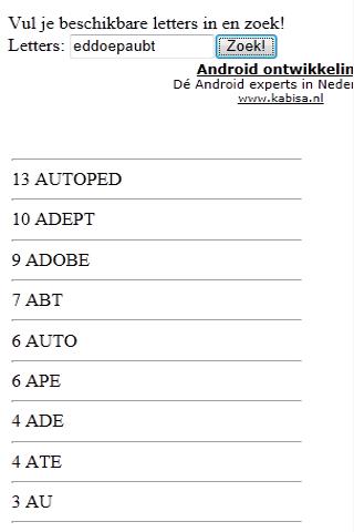 WordFoei helpt u bij het spelen van WordFeud. U vult een reeks letters in, waarna de app u mogelijke woorden en de bijbehorende score teruggeeft.