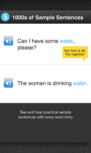 - Thousands of Sample Sentences: See and hear practical sample sentences with every word entry