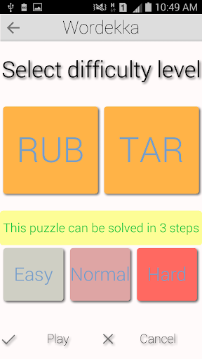 The puzzle has two play modes: Practice and Challenge. In practice mode, you can create your own puzzle by selecting two words. Also, you are guided to the puzzle solution by prompting you about which letter needs to be changed. In challenge mode, the words are chosen based upon the difficulty level chosen by you - Easy, Normal, or Hard.