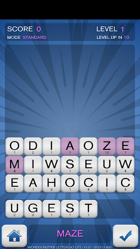 In standard games the speed of the game increases with each level reached. Every ten words the level increases as does the point values. There are also green colored bonus letter tiles that will provide help or bonuses but will only show up occasionally.