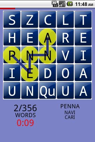 Choose between Italian, English, Spanish or French dictionary, the size of the board and the time and try to find as many words as there is possbile.