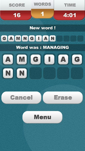 For each new word to find the letters are mixed and displayed in the center of the screen. Press to redial those below the word. The word is formed in the order you select letters. It is possible to cancel the last letter proposed with the "Cancel" button or restart with the word "Erase" button.