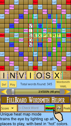 Black box cheat apps can crank out a few high-scoring words, but cheats don't provide any real insight into your game. By contrast, this helper finds and shows, on a full game board, EVERY WORD you could have played from your game's rack, best words first, and then LIGHTS UP the BEST spots "like the eyes of an expert"℠ with its color-coded "Heat Map" feature.