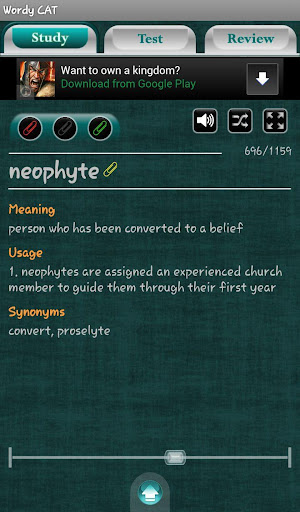 There are three sections in the application viz. “Study”, “Test” and “Review”. The application can be run in a vocab flashcard mode while in Study section. Users may tag words as they study and retrieve them later for review. Study section offers review of words in either sequential or random order. For pronunciation savvy students, it also offers to pronounce the word.