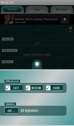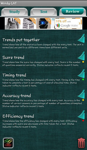 Test section has limited set of words in Wordy CAT. It also offers a full fledged tracking of test results through set of graphs which are accessible on Review panel. This allows a user to track his/her progress over time and let them assess their weak areas. To access complete test features and fully utilize the review section please buy Wordy+ CAT.