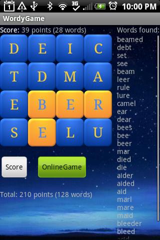 Wordy is a fun and addictive word puzzle game to find as many English words as possible in the board. Each board is randomly created. You can play it anytime, anywhere, at your own pace.