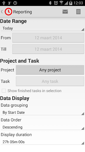 The application provides an interface for managing the tasks, projects and time registrations. It also includes a reporting module to make enhanced reports right on your Android smartphone. You can generate reports based by filtering your time registrations by date (pre-defined date ranges or a custom date range) and by project and task. You can also define the layout of a report (grouped by start date or project) and order descending or ascending (on the start date or the project). And you can define how the totals in the report are calculated (hours-minutes-seconds, days-hours-minutes-seconds (with 24h/day) or days-hours-minutes-seconds (with 8h/day)).
