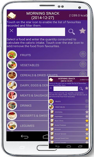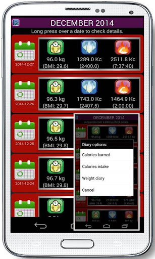 - Intake calories: there is a list of foods with their calories or you can also add yourself. Everything will be recorded in a diary.