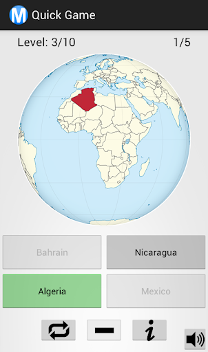 Do you know the location of all the countries of the world? In this quiz game you will have to choose the right answer (from four) corresponding to the country of the location displayed on the screen. You will have three helps available each time you play: change question, reduce the number of answers to just two or get additional information on the flag. But be careful, you can only use them once in each game! This quiz game is divided in 10 different levels and each level is divided in 5 questions and you can choose from regular mode or time mode. Can you beat all the 10 levels?