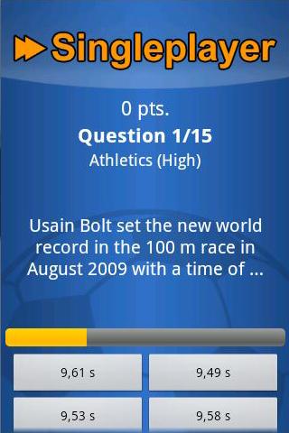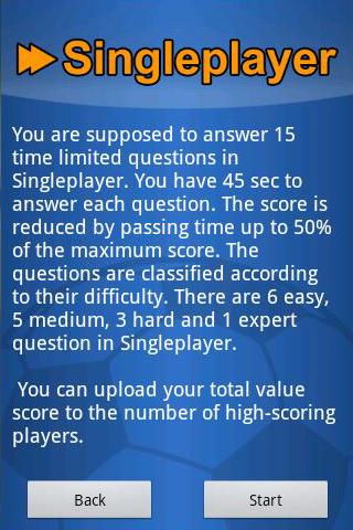 Singleplayer provides you with 15 multiple-choice questions of different categories and difficulties based on random selection. After finishing your game you can upload your score online and compare your result with the high-scoring players. T