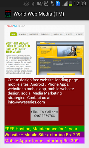 Download Now! FREE Sample Mobile App & Mobile Icon from World Web Media (TM) displaying products, services, % Offers, contact email, phone (Direct Click-to-call). Similarly get your Corporate, Company, Brand Mobile App & let the world know about your Brand. Other features available are: e-commerce online app, cash-on-delivery,upload multiple product/service images, Add social media links like: face-book, twitter, links to your website, blogs etc. FREE download & FREE Hosting on internet & on indiappstore. Email us: info@wweseries.com for a Quote & Affordable prices!