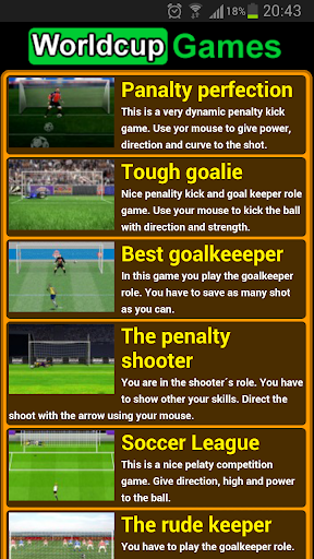 In this awsome app you will find all kind of soccer sport games. There are penalty shooting games where you will can feel the goalkeeper role as well as the shooter role. Games are very dynamic and funny. Live the final match as you were in the field.