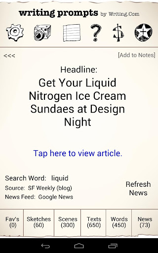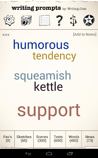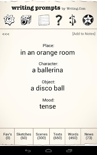 ** Four prompt generators: Scenes, Sketches, Texts and Words. Store your favorite prompts into the "Fav's" tab by tapping the favorite star on any prompt.
