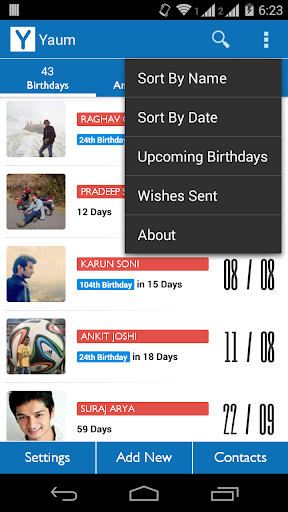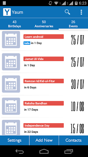 Yaum is Android's Birthday / Anniversary Reminder app with Automated SMS, Alarm Notification, Posting wishes to Facebook Wall, Call reminders and a Contacts Backup Tool. It syncs your Facebook friends' birthdays and sends automated SMS with your custom, pre-filled birthday/anniversary wishes.
