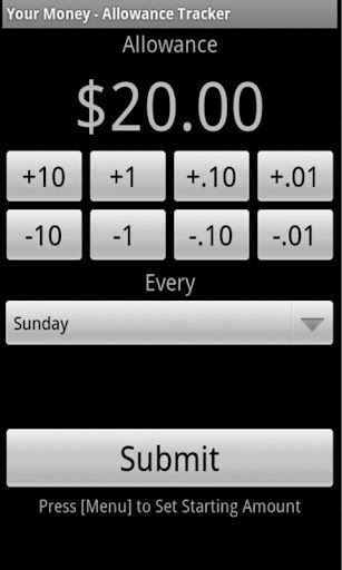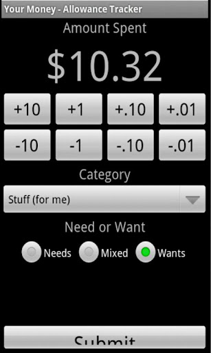 Manage your money better with the Your Money - Allowance Tracker. Automatically adds money to your current allowance and allows you to track how you spend it. The built-in spending analyzer lets you clearly see how and where money is going. The easy to use intuitive interface is perfect for both children and adults who wish to better track their spending.