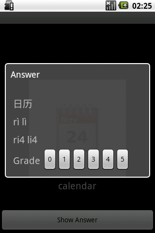Yuwen Flash Card is a SuperMemo based Chinese flash card application, it provides thousands of flash cards in assisting you learn and memorise Chinese characters and words. Each card present an image and its English meaning, and challenge you to remember the Chinese words. Answers include Chinese words and Pinyin pronunciation (with tone mark and with tone number). The SuperMemo method is applied to optimise the card scheduling.