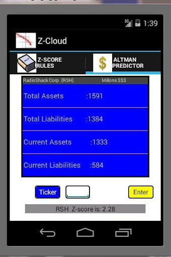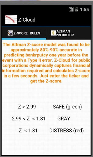 Z-Cloud for public corporations dynamically captures financial information required and calculates Z-score in a few seconds. Just enter the ticker and get the Z-score.',