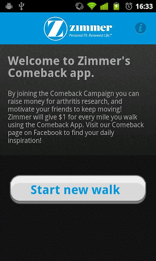 For every mile walked with the Comeback App, Zimmer will donate $1 to the Arthritis Foundation. The Zimmer Comeback App uses the GPS in your phone to track the miles and route you walk. Users can share their route map and walk photos on Facebook. A leaderboard will display the users that donate the most miles on the Zimmer Facebook page. Zimmer Comeback can be used when walking or running.