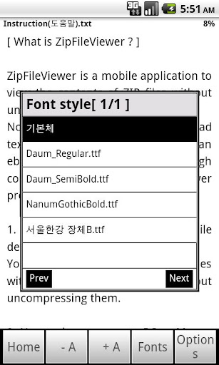 폰트파일(TTF)을 이메일 동기화하거나, 폴더(/ZipFileViewer/fonts)에 폰트파일을 복사 삽입하면 폰트가 추가되며, TXT파일 보기 기능의 설정창에서 폰트 선택, 적용이 가능합니다.