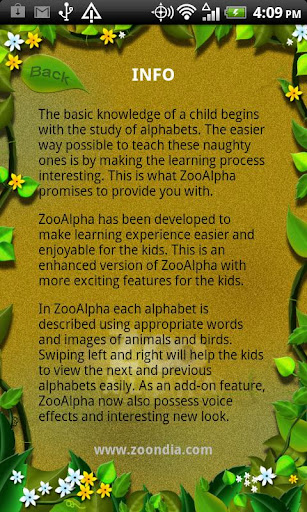 The basic knowledge of a child begins with the study of alphabets. The easier way possible to teach these naughty ones is by making the learning process interesting. This is what ZooAlpha promises to provide you with.ZooAlpha has been developed to make learning experience easier and enjoyable for the kids. This is an enhanced version of ZooAlpha with more exciting features for the kids.In ZooAlpha each alphabet is described using appropriate words and images of animals and birds. Swiping left and right will help the kids to view the next and previous alphabets easily. As an add-on feature, ZooAlpha now also possess voice effects and interesting new look.