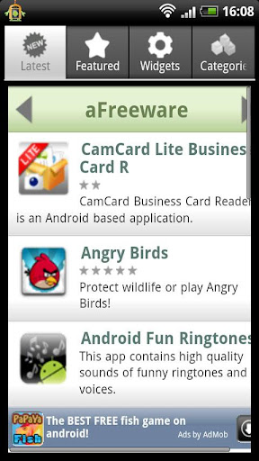 aFreeware is compatible with most of the Android devices, once installed it lets you browse, download and install FREE applications directly on your phone. It pulls content from http://www.androidfreeware.net, and shows Latest Apps, Featured Apps, Widgets and Categories are listed for browsing more apps.