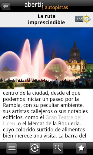 Totalmente gratuita, Abertis pone a tu disposición todo lo que quieres saber sobre la ciudad que visitas. Esta app para teléfonos Android reúne la historia de una ciudad, sus puntos de interés, dónde tomar algo, dónde comer, los locales nocturnos, los centros de compras… y, por supuesto, a qué distancia exacta están de ti y cómo puedes llegar hasta allí. Todo a tu disposición ¿quieres verlo?
